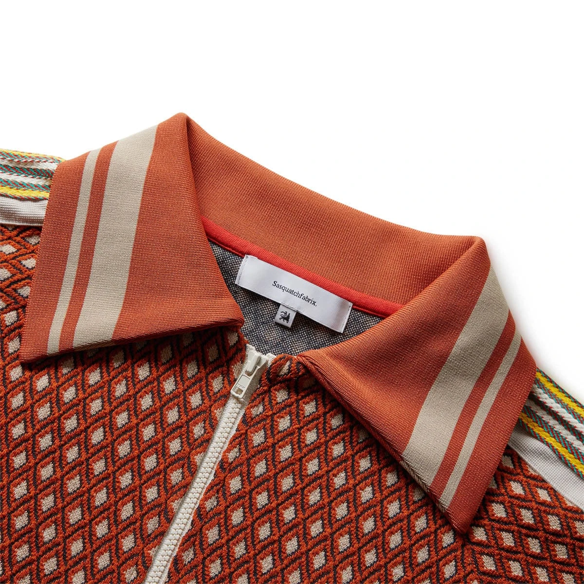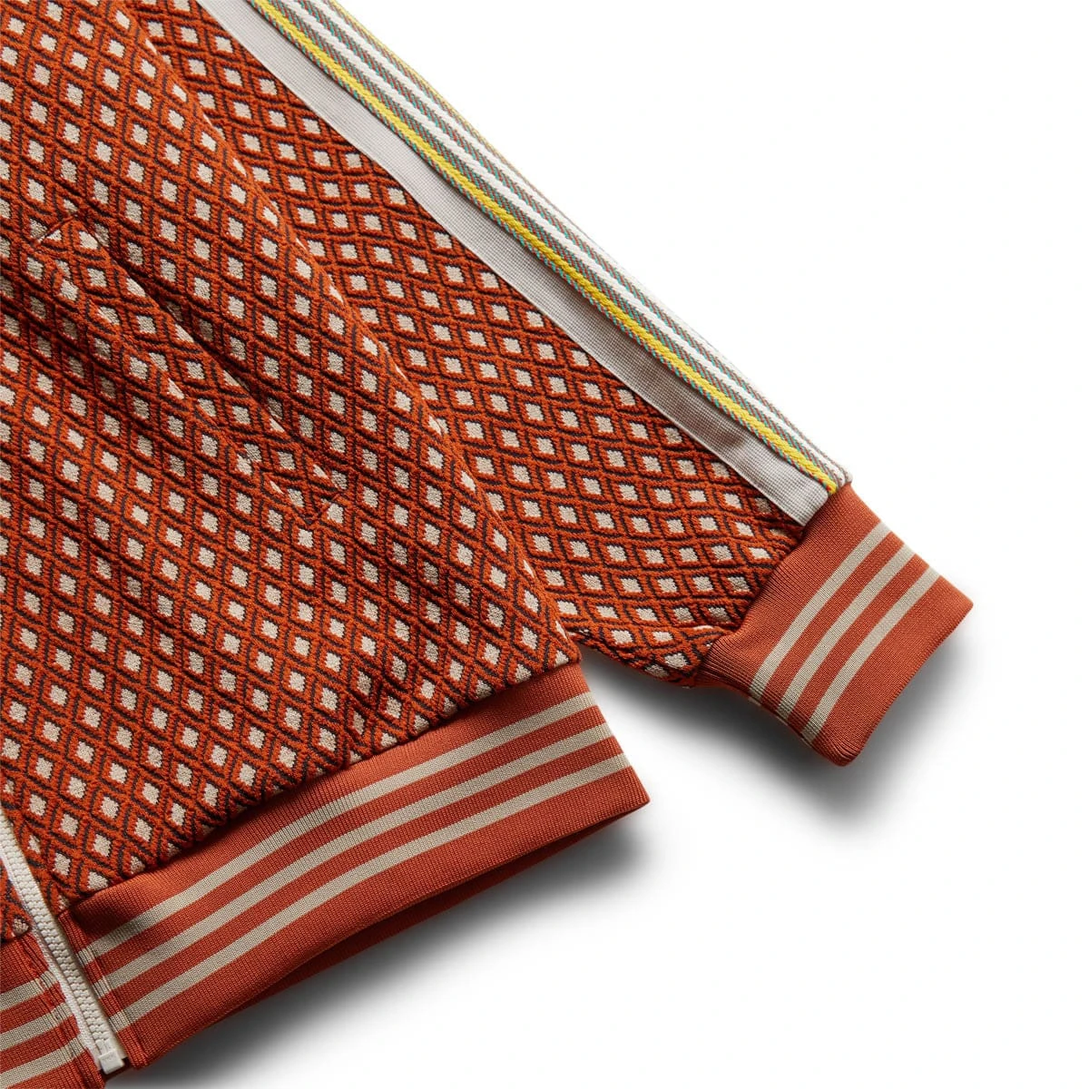 Sasquatchfabrix’s orange Retro Track Jacket is made from technical and wool-blend jacquard in a retro diamond motif with taped side stripes.